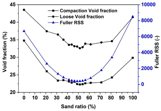Void fraction and Fuller RSS (Cf. Equation (3)) as a function of sand volume fraction in sand-gravel mixtures.