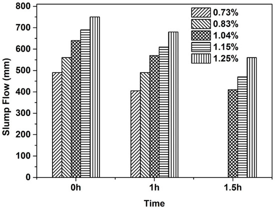 The impact of SP on flowability of concrete mixtures at fresh state is first studied based on one of the optimum proportions of sand-gravel mixtures. For the representative concrete mixture, the aggregate volume fraction in concrete mixture is set as 62.5%, the sand volume ratio in total aggregate mixtures is set as 53.0%. Five dosages of SP in concrete mixtures were studied and the slump flow of fresh concrete mixtures at different time after mixing is presented in Figure 6. It should be first noted that no obvious segregation phenomenon was observed for all the fresh concrete containing various SP contents and the measurement uncertainty of the slump flow in this study is always within 5% (i.e., lower than 20 mm) of the measured spread value.