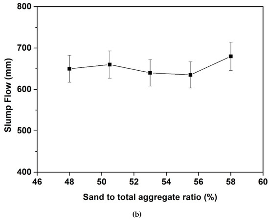 Moreover, as seen in Figure 8b, no obvious changes in compressive strength can be found in the case of varying the sand to sand-gravel mixtures volume ratio by 10%. This can be attributed to the fact that all the concrete mixtures with different sand to sand-gravel mixtures volume ratio keep the same total aggregate content. In addition, since the concrete mixtures present similar flowability (Cf. Figure 7b) there is no obvious difference in casting process and tendency of static segregation (which can be neglected herein). It should be finally noted that, for most of the concrete mixtures with slump flow higher than 600 mm, their compressive strengths at 28 d all meet the designed strength grade (i.e., 45 MPa herein).