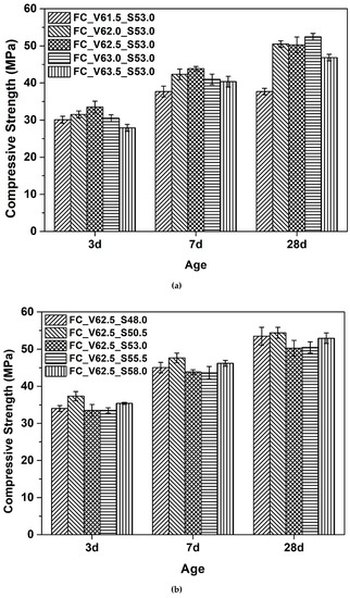 Figure 8 presents the influence of aggregate volume fraction (Cf. Figure 8a) and sand to total aggregate volume ratio (Cf. Figure 8b) on compressive strength of fluid concrete mixtures. It can be seen in Figure 8a that for the concrete mixtures containing the lowest and highest amount aggregates in the current work, the corresponding compressive strengths are markedly lower than the rest of three concrete mixtures. This phenomenon is even more obvious at later age (i.e., 28 d herein). For the concrete mixture with the lowest aggregate content, the decrease of the strength might due to the static segregation of specimen upon casting. For the concrete mixture with the highest aggregate content, the decrease of the strength can be attributed to the lack of compaction during casting since no vibration was performed.