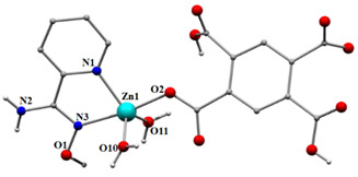1 crystallizes in the triclinic space group Pī. Its structure (Figure 1) consists of mononuclear [Zn(H2pma)(H2pyaox)(H2O)2] species. The coordination sphere of the metal centre is completed by one terminal N,N′-bidentate chelating H2pyaox ligand, two terminal water molecules, and one double deprotonated H2pma2− ligand. Zn1 is five-coordinate adopting a distorted trigonal bipyramidal geometry (τ = 0.8) with O2 and N3 occupying the axial positions [111].