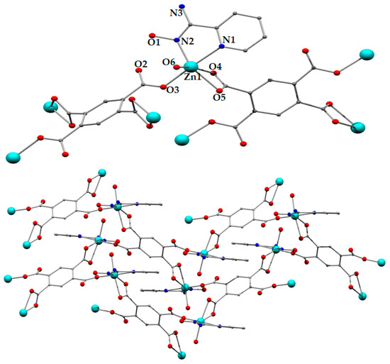 2 crystallizes in the triclinic space group Pī; its structure (Figure 2) is a 1D double chain formed by the connection of [Zn(pma)0.5(H2pyaox)] repeating units through the μ4-κO; κO′; κO″; κO‴ pma4− ligand. The coordination sphere of the metal ion is completed by two terminally ligated carboxylate groups from two different pma4− ligands, and one neutral N,N′-bidentate chelating H2pyaox ligand. Zn2+ adopts a tetrahedral coordination geometry. Both hydrogen atoms from the NH2 group participate in hydrogen bonding interactions in which carboxylate groups from neighboring chains act as acceptors (N3···O3 = 2.959 Å, H1N···O3 = 2.091 Å, N3-H1N···O3 = 168.57°; N3···O4 = 3.046 Å, H2N···O4 = 2.292 Å, N3-H1N···O4 = 150.68°). The extensive hydrogen bonding interactions in 2 result in the formation of a 3D network (Figure S1 in Supplementary Materials).