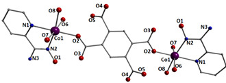 Compounds 4 and 5 display related structures with their main difference being the type of the 3d metal ion (4, Co2+; 5, Mn2+). Thus, only the structure of 4 will be discussed in detail. Compound 4 crystallize in the monoclinic space group P21/n and its structure consists of the dinuclear complex [Co2(pma)(H2pyaox)2(H2O)6] (Figure 4). The dinuclear molecules lie on a crystallographic inversion center with the two Co2+ atoms being bridged by the μ-κO;κO′ pma4− ligand. The coordination sphere of each metal ion is completed by one neutral N,N′-bidentate chelating H2pyaox, and three terminal water molecules. The metal ion is six-coordinated displaying a slightly distorted octahedral geometry as a result of the relatively small bite angle of the chelating ligand (N1-Co1-N2 = 75.1(2)°).