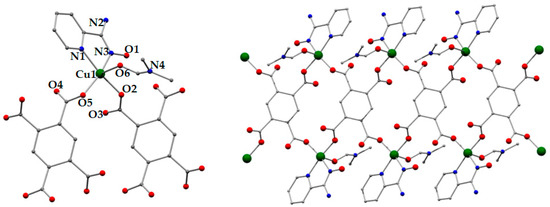 Cu1 is five-coordinate adopting a tetragonal pyramidal geometry (τ = 0.01) with O3, O6, N1, and N2 occupying the basal plane vertices and O2 the apical position [111]. There are strong intrachain hydrogen bonding interactions that stabilize the crystal structure of 8; these are formed between the oximic group (O1, donor), and the carboxylic group of the pma4− ion (O5), which acts as the acceptor (O1···O5 = 2.669 Å, H1O1···O5 = 1.912Å, O1-H1O1···O5 = 155.10°). The shortest Cu···Cu distance (6.5 Å) is between atoms of the same chain, whereas the shortest interchain metal···metal distance is 7.7 Å; it is noteworthy that the latter is shorter than the intrachain distance between metal atoms that belong to different chains of the 1D-double chain (8.8 Å) in 8.