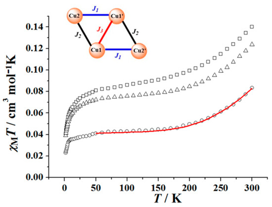The isotropic Heisenberg spin Hamiltonian for 9 is given by Equation (13), where J1 is associated with the Cu1…Cu2′ interactions through a diatomic oximato group; J2 is associated with the Cu1…Cu2 interaction through one monoatomic carboxylate bridge; and J3 describes the coupling of Cu1…Cu1′ through a μ3-OH− group (Figure 11).