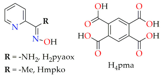 Herein, we report on the synthesis, structural characterization, and physical properties of nine new coordination polymers, including the first oxime-based MOFs, by the use of a 2-pyridyl oxime (pyridine-2 amidoxime, H2pyaox, and 2-methyl pyridyl ketoxime, Hmpko) in combination with 1,2,4,5-benzene tetracarboxylic acid (pyromellitic acid), H4pma (Scheme 1); the latter has been employed in the field of MOFs [96,97,98,99,100,101,102,103,104], but its combination with an oximic ligand is unexplored. The 3D MOF [Cu4(OH)2(pma)(mpko)2]n (9) displays selectivity for Fe3+ adsorption.