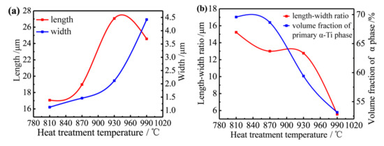 The influence of normalizing temperature on the length, width, length–width ratio and the aspect ratio and volume fraction of primary α-Ti phase are shown in Figure 5. It can be seen from Figure 5a that with the normalizing temperature increasing, the length of the lath-shaped microstructure first increases and then decreases, and the maximum value appears at the normalizing temperature of around 945 °C. As the increase of the normalizing temperature occurs, the width of the lath-shaped microstructure increases. Accordingly, growth rate becomes slower when the temperature is below 930 °C while becomes faster above 930 °C. Figure 5b showed that the length–width ratio of the lath-shaped microstructure decreases with the increase of temperature from 870 °C to 930 °C. What is more, the content of the primary α-Ti phase decreases gradually with the increase of temperature which becomes slower in the temperature range of 810~870 °C. After the temperature reaching 870 °C, it is preliminarily concluded that the heating temperature is close to the α+β two-phase region.