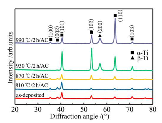 The XRD analysis results of TC4 as-deposited and normalized specimens at different temperatures are shown in Figure 8. A large number of diffraction peaks of α-Ti phase exist in the specimens as-deposited and normalized at 840 °C and 870 °C, including (100)α, (002)α, (101)α, (102)α, (110)α, and (103)α, respectively. With the increasing of normalizing temperature, the diffraction peaks intensity of β-Ti phase does not change much. The reason of weak diffraction peaks of the β-Ti phase is that the normalizing temperature in the single phase region of α-Ti phase has not got into the α + β phase region. Therefore, there is no transition from α-Ti phase to β-Ti phase, while the residual β-Ti phase will transform into α-Ti phase increasing and keep the temperature in this region. When the normalizing temperature is 930 °C, the diffraction peaks of (100)α and (002)α disappear. But the diffraction peaks of (101)α, (102)α, (110)α, and (103)α have an obvious increased intensity. The diffraction peak of (200)β appears at 2θ ≈ 57°. At the normalizing temperature of 990 °C the diffraction peak of (101)α and (102)α decreases. On the contrary, the diffraction peak (110)α increases. At the normalizing temperature of 990 °C, the diffraction peak of (200)β is basically the same as that of 930 °C.