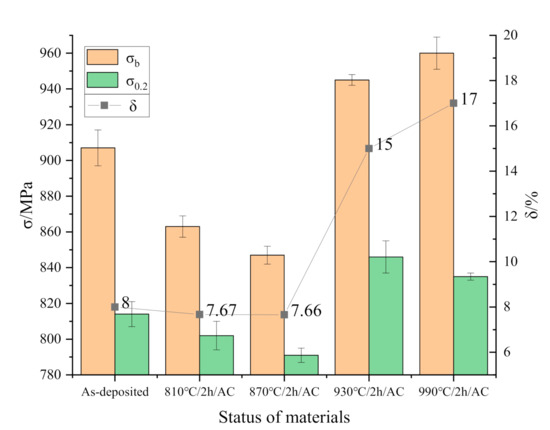 The tensile properties of as-deposited specimens and the other four normalizing parameters are chosen to compare in Figure 10. The stress and elongation of each sample were measured three times respectively and the average value was obtained At the normalizing temperatures of 810 °C and 870 °C, the tensile strength (σb), yield strength (σ0.2), and elongation (δ) are almost the same as that of the as-deposited state. With the length and width of the α-Ti phase increasing during normalizing treatment, a large number of slender primary α-Ti phases are easy to break and hinder the movement of dislocations resulting in a decrease in the deformation compatibility and strength and plasticity of the specimens. Tensile strength, yield strength and elongation are higher than those of as-deposited phase at normalizing temperature of 930 °C and 990 °C. The elongated primary α-Ti phase will be truncated during the precipitation of β-Ti phase and the primary α-Ti phase will be transformed into short rod-like or equiaxed crystal due to the precipitation of β-Ti phase from primary α-Ti phase at high temperature. The comprehensive mechanical properties of the specimens after normalizing are better than the national standard of forgings (σb ≥ 895 MPa, σ0.2 ≥ 830 MPa, δ ≥ 10%).