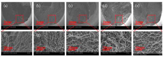 Fractographs of selective laser melting TC4 titanium alloy of tensile test at room temperature. (a) As-deposited before normalizing (30X), (b) 810 °C/2 h/AC(30X), (c) 870 °C/2 h/AC, (30X) (d) 930 °C /2 h/AC(30X), (e) 990 °C/2 h/AC(30X), (f) As-deposited before normalizing (2kX), (g) 810 °C/2 h/AC (2kX), (h) 870 °C/2 h/AC (2kX), (i) 930 °C /2 h/AC (2kX), (j) 990 °C/2 h/AC (2kX).