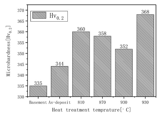 The microhardness of matrix, as-deposited samples and different normalizing temperatures are shown in Table 4. Above mentioned microstructures evolution trends are confirmed by image analysis data displayed in Figure 12 for the different normalizing temperature by selective laser melting. With the rising of normalizing temperature, the microhardness declines slightly due to coarsening of microstructures. From Figure 12 when the temperature is below 960 °C, the curve of hardness is basically unchanged. While the normalizing temperature is 990 °C, the hardness increases obviously at this time. At this time α phase in the tissue becomes elongated needle shape. This is because the specimen is completely transformed into β at 990 °C. Because of the high temperature and the large temperature gradient with room temperature, even in air cooling, the cooling speed is very fast that makes the transformation of β→α incomplete and the formation of very fine α phase in the cooling process leading to the obvious increase of hardness. The hardness of TC4 titanium alloy made by laser additive manufacturing is high, which is determined by the typical Widmanstätten structure in the deposition area of titanium alloy. The thin lamellar phase and the very fine Widmanstätten lath will increase the hardness in the sedimentary area. On the other hand, rapid heating and cooling increase the solid solubility of the internal phase so as to improve the hardness of titanium alloy deposition area in the process of selective laser melting.