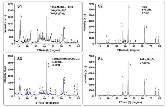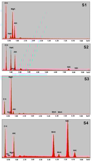 It can be observed from Figure 4 that the Mg-Al LDH and Mg-Al-Ni LDH exhibit agglomerates with compact and non-porous structure. The LDH particles are uniformly shaped sheets, most of them being hexagonal. After adsorption, LDH materials present several heterogeneous small pores, which are known to provide larger surface area for contaminant adsorption. The introduction of the Ni ion into the Mg-Al LDH structure could create more exterior hydroxyl ions (OH−). This could form chemical precipitates which lead to a reduction in the adsorption capacity. In the case of sample S4, the present elements were uniformly distributed. The particles observed in the SEM image are not precipitated, but they are small fractions of samples that remain on the analyzed surface. Sepehr et al. [11] showed that the surface area of the magnesium/aluminum layered double hydroxide (LDH) nanoparticles was 109 m2/g. Moreover, the surface morphology images of the LDH nanoparticles revealed that the adsorbent surface consisted of hexagonal nanosheets with a diameter between 200 and 1000 nm. Teixeira et al. [25] related that the morphology images for synthesized Mg-Al LDH and ternary Mg-Mn-Al LDHs (LDH-IW), exhibited the agglomerates with different sizes. The LDH-IW exhibited high crystallinity and structural properties like those of LDH, although the particle size was smaller. The results were in accordance with the XRD analysis, where the calculated particle sizes were 15 nm (LDH) and 12 nm (LDH-IW), respectively.