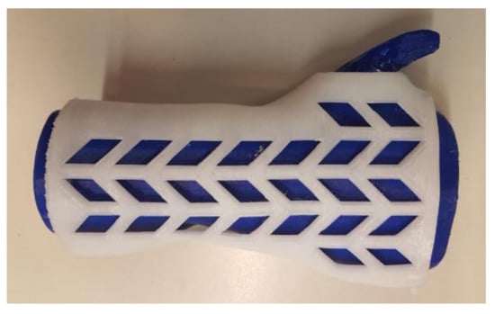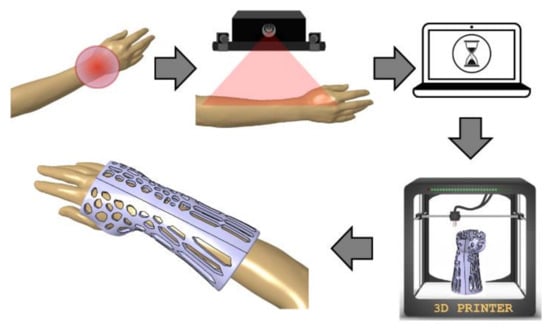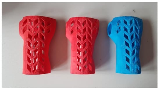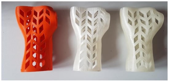 One of the most popular classes of 3D-printed medical products in wide use are orthopedic supplies, especially limb orthoses [18,19,20]. The orthoses are medical supplies that keep a selected part of a patient’s body rigid and safe during healing or convalescence. This is usually accomplished by immobilizing and protecting the area around a joint from deformations and physical damage. The orthoses may also be used for enforcement of a specific position and mutual orientation of various body parts [21]. They can be universal, relatively inexpensive orthoses or customized (much better in terms of healing function and comfort) products made for a specific patient based on their anatomic measurement [22].