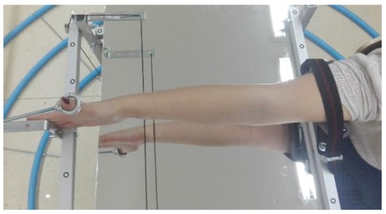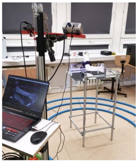 First, the patient’s forearm was 3D scanned on a specially designed work stand, equipped with a David SLS-3 optical scanner (David Vision Systems GmbH, Koblenz, Germany) (Figure 2) moving along a circular track. In total, 6 scans were made—4 direct scans in different positions of the scanner and 2 scans of its mirror image. This is a novelty—during preliminary studies it was found that it is possible to capture 3D point clouds of objects visible in a regular mirror using structural light scanning, so there is neither need of changing a patient’s position during the scanning nor changing angles between the scanner and the work stand. During the whole process (lasting approx. 5 min), the patient’s forearm must rest on a special construction and remain still (Figure 3).