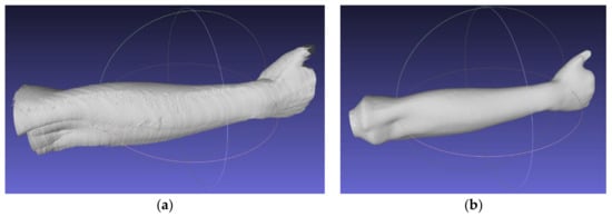 Using open-source MeshLab software (version 2019, Istituto di Scienza e Tecnologie dell’Informazione, Pisa, Italy), an automated algorithm of 3D scanning data processing was created by the authors. The algorithm first, aligns the scans (using transformations obtained in the work stand calibration procedure), then removes the unnecessary data and transforms the scans into a correct global coordinate system. The next stage is to create an entirely new mesh using the screened Poisson surface reconstruction algorithm [33]. The final forearm geometry (mesh) is shown in Figure 4.