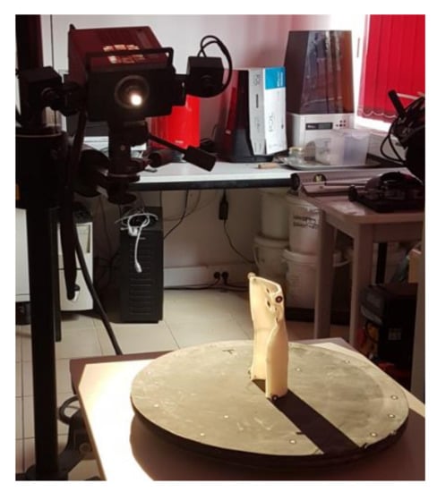 The patient fit and accuracy assessment was subjective—the patient wore all the manufactured orthoses and used each for 15 min, assessing them in a binary way (ok–not ok) and made a surface quality assessment on a 1–3 scale. Selected orthoses representing all the materials, orientations and strategies were also subjected for acceptance of a qualified orthopedist. The accuracy was also measured objectively—selected orthoses were 3D scanned using a GOM Atos I structured light scanner (GOM GmbH, Braunschweig, Germany) (Figure 6) and the resulting scans were compared with the nominal CAD model, to find general dimensional deviation (in a standard quality control procedure). The strength tests were performed as a final stage and are described in more detail in the next chapter.