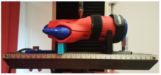 The strength testing of the manufactured wrist–hand orthoses consisted of a destructive quasi 3-point bending test of the whole orthosis. To simulate bending with a patient’s hand inside, a two-material forearm phantom was manufactured. Based on the 3D scan (Figure 4b), an outside shell and a core in the shape of a conical rod were modeled. The shell was made of TPU (elastic thermoplastic polyurethane) (Fiberlab S.A., Brzezie, Poland) material, infill 15%, the core was made of ABS (Spectrum Group, Pęcice, Poland), infill 30%. This is how the imitation human forearm was manufactured. A tested orthosis was assembled on a forearm phantom (Figure 7).