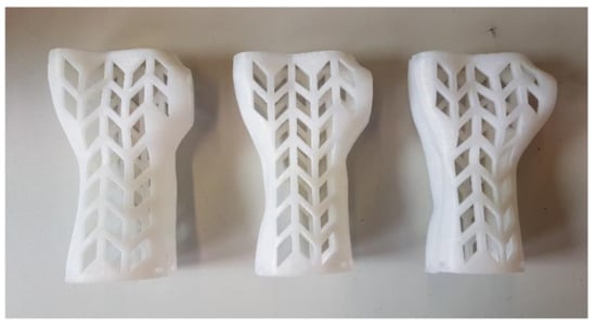 This paper mainly addresses the issue of 3D printing of openwork wrist–hand orthoses, an idea popularized by the design of Jake Evill [29] and described in known literature [19,24]. Currently, there are many designs available, such as the Xkelet [30], Osteoid [31] and many others [24]. However, the current literature does not contain works on selection of the best material and process parameter combinations to obtain optimal results in terms of strength, fit and surface quality, usability and cost and time, especially regarding orthoses that are designed automatically. The results of experimental work on the matter are presented in this paper.