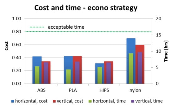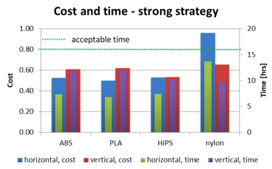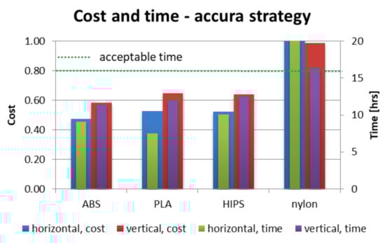 As shown in Figure 12, Figure 13 and Figure 14, nearly all process parameter combinations make production of affordable orthoses possible. They can be manufactured cheaper than the equivalent non-individual, mass-produced orthoses. The one case where this is not true is in a nylon orthosis manufactured in accura and strong strategies in horizontal orientation—this is due to a large amount of support material and low extrusion speed. Most orthoses also fulfill the short time criterion—only the nylon orthosis in the accura strategy exceed the acceptable time, with the horizontally manufactured one being the slowest to manufacture (and the most expensive) by a wide margin—it took almost 28 h to obtain both parts of the orthosis, with the cost coefficient of approx. 1.8 (not exceeding 1 for all the other combinations).