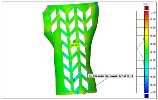 In terms of measurement by 3D scanning, the lowest average deviation (the mean fit error) was found for orthoses made of PLA in vertical orientation—it was between 0.13 and 0.18 mm. The largest deviations were found, as expected, in the horizontally manufactured orthoses in the econo and strong strategies (various materials)—they ranged from 0.43 mm to 0.57 mm. The highest deviation for orthoses manufactured using the accura strategy did not exceed 0.28 mm, which translated into the lowest average for this group (0.2 mm). The differences between the econo and strong strategies are not statistically significant. As no orthosis presented deviation higher than the assumed 1 mm, none was marked as unacceptable on these grounds. An example of a colorful deviation map, resulting from comparison of a 3D-scanned orthosis with the nominal CAD model is shown in Figure 15.