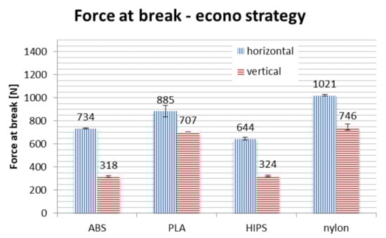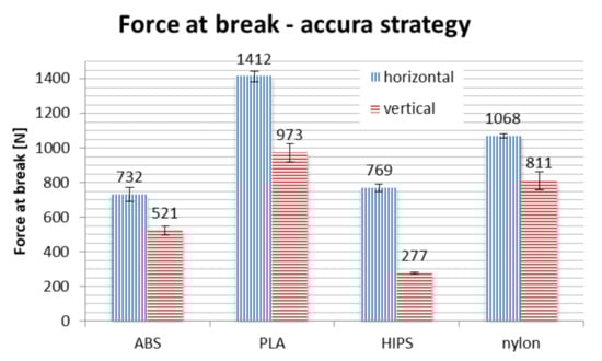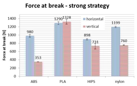 Results of strength testing divided by strategies, for different materials and orientations, are shown in Figure 16, Figure 17 and Figure 18 and in Table 3.