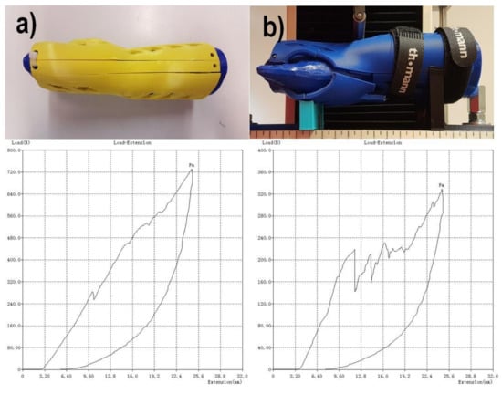 The result of each test is a course of a load–displacement diagram, obtained from the used strength testing machine. The test was carried out until an orthosis was destroyed (by cracking) or visibly deformed. As a threshold of positive evaluation of a given orthosis, a load of 300 N was assumed (representing a static bending using an item of 30 kg mass). The value was set arbitrarily, based on discussion in the project team, with mechanical and biomedical engineers and with expert participation of orthopedists and physiotherapists, who stated that in practice, such orthoses do not need to bear higher loads.