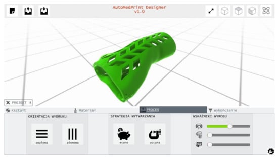 The study results and conclusions were considered in the next phase of the project. The product configurator application was built and implemented as a part of the created prototype of the AutoMedPrint system. The selection of materials and process parameters was included as a configurable option, with selection having impact on product looks and properties. The product configurator is shown in Figure 20.