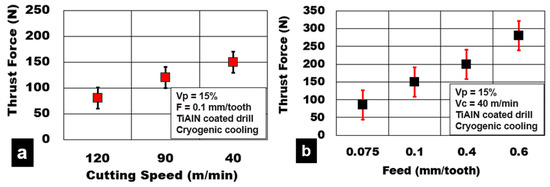 - Thrust forces during cryogenic machining increased by 250% due to an increase in feed/tooth (0.05 mm/tooth to 0.6 mm/tooth) and by 87% with decreasing cutting speed (120 m/min to 40 m/min).