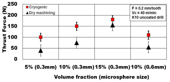 - During cryogenic drilling, the higher the volume fraction of hollow alumina microspheres (15%) and the finer the average size of the microspheres (0.3 mm), the higher was the thrust forces by 45% and 36%, respectively.