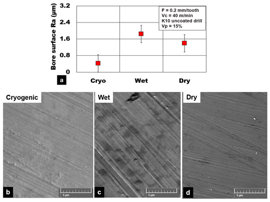 Effect of cooling medium on machined bore surface roughness (Ra) during plunge drilling of AZ31-15% hollow alumina syntactic foam. (a) Graphical illustration; (b) cryogenic; (c) wet; (d) dry.