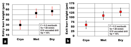 Figure 9 shows the burr height values measured at the hole entry and exit locations on the holes, respectively. The majority of the dry machining conditions produced burrs due to material push-out induced due to thermomechanical loads that act during the drilling process. It is well known that during dry machining conditions, the AZ31 magnesium plasticity is enhanced due to high heat generation in the shear zone. This increases the cutting temperature and torque value required to shear through the material compared to cryogenic and wet machining conditions. Observation of the machined surface shows that dry cutting produced higher plastic deformation of the AZ31 magnesium matrix and material side flow, resulting in higher burr formation. On the other hand, cryogenic cutting conditions (60 µm) resulted in at least 55% lower values of burr height compared to wet machining (115 µm) and dry machining (130 µm). Compared with exit hole edges, burr heights at the entry side of the holes on an average were 45% lower for all cutting conditions considered in this study. Wet machining produced edges that had 15% lower values of burr height than dry machining conditions.