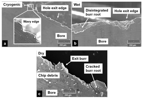 Burr types at the exit side of the hole: (a) cryogenic, (b) wet, (c) dry.
