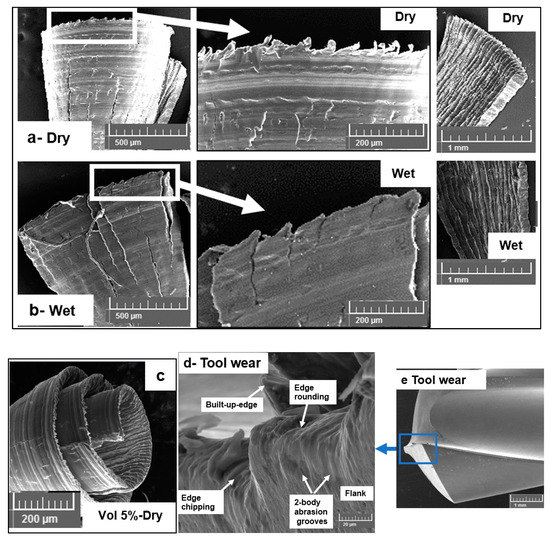 Chip forms during machining AZ31-15% alumina syntactic foam: (a) dry cutting, (b) wet cutting, (c) dry cutting AZ31-5% alumina, (d,e) tool-wear during cryocooling.