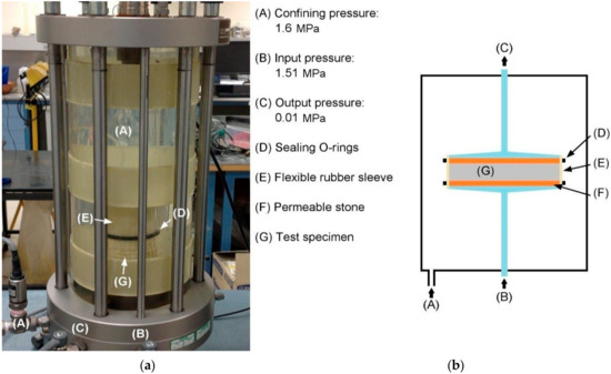 Test specimens were installed into a triaxial permeameter cell as shown in Figure 3. Three 3 MPa standard pressure/volume controllers (STDDPC V2) from GDS Instruments (Global Digital Systems, Hook, Hampshire, UK) were used to provide and record the confining, input, and output water pressures of 1600 kPa, 1510 kPa, and 10 kPa, respectively, corresponding to a pressure gradient of 1500 kPa across the specimens. Tests were conducted over 4–5 days (until steady-state conditions were achieved—i.e., approximately equivalent inflow and outflow rates) with a recording interval of 60 s.