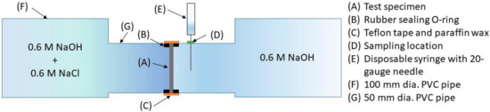 A steady-state chloride ion diffusion test was conducted on sectioned 28 day-old biscuit specimens R1, C05, C10, P10, and C25 (mean thicknesses of 2.1–4.5 mm) over a period of 9 months, using the set up illustrated schematically in Figure 4. After sectioning and rinsing with distilled water to remove cutting detritus, duplicate specimens were carefully installed into the apparatus, which was then gently clamped and sealed with water- and chloride-impermeable tape to ensure a tight seal. Poured into the reservoirs on either side of the test specimens was 2.5 L of 0.6 M NaOH sink solution, and 0.6 M NaOH with the 0.6 M NaCl test solution.
