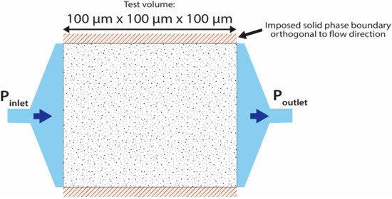 Simulations were conducted on 100 μm × 100 μm × 100 µm cube volumes of interest (VOI), previously segmented between pores and solid materials. Selected regions contained connected pore networks (i.e., pore regions connected to the edges of the VOI in at least one of the three cardinal directions), but, due to software restrictions, only 6-voxel connectivity was considered for the connected pore network.