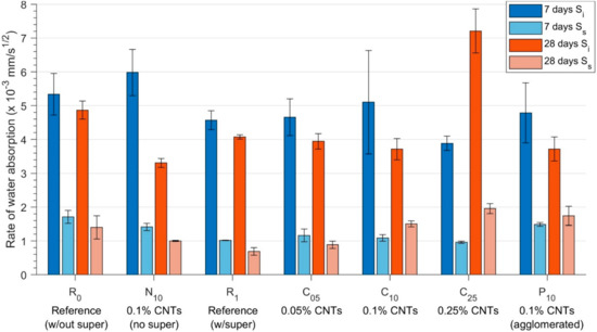 Results showed that the initial water sorptivity of a 28-day cement paste with 0.1 wt.% CNTs (without a superplasticiser) was up to 32% lower than the reference cement paste. However, poorly-dispersed 0.1 wt.% CNTs (with a superplasticiser) exhibited a deterioration in water sorptivity resistance of up to 153%, resulting from a more connected surface pore network from the agglomerated CNTs, which was supported by porosimetry characterization.