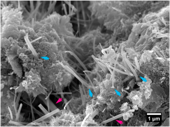 A secondary electron micrograph of fracture surface of specimen C10, 7 days, showing CNTs embedded within C-S-H formations (blue arrows) within the hydrated cementitious microstructure. Ettringite structures are indicated by magenta arrows.