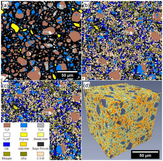 The Virtual Cement and Concrete Testing Laboratory software (VCCTL, Version 9.5, National Institute of Standards and Technology, Gaithersburg, MD, USA) [45,46,47,48] was employed to simulate the 3D microstructural development of a virtual cement with similar composition and curing conditions to the experimental reference paste R1 used in this research. The virtual cement, at simulated ages of 7 and 28 days of hydration, was then segmented and characterised within the Avizo 9.0.1 software (Version 9.0.1, Thermo Fisher Scientific Australia, Scoresby, VIC, Australia) environment for comparison with the experimental results.