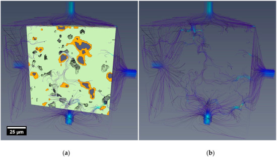 Further, visualisations of the flow paths through the microstructures, exemplified in Figure 9, highlight the tortuous routes and relative spatial relationships between regions of higher flow and solid materials. In each figure, the velocity of the simulated flow path is represented by a red-blue (high to low velocity) colour gradient, while the number of neighbouring flow lines is indicative of the flow volume.