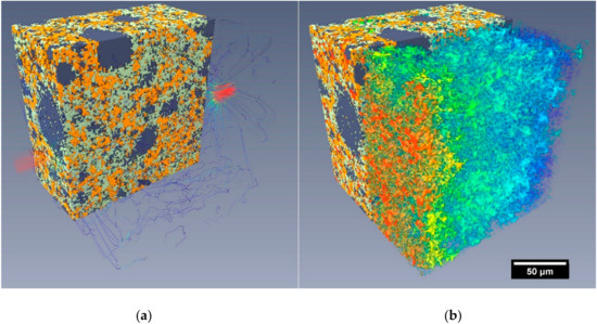 The examination and subsequent segmentation of the microstructure of specimens for fluid flow simulations was performed according to a process detailed in a companion study previously reported by the authors [16]. Cropped 500 µm × 500 µm × 500 µm volumes (resolution of 0.9–1.3 µm) were produced from the X-ray computed microtomography (XR-µCT) experimental datasets investigated in this study. Here, only the threshold differentiating between the porosity and solid fractions of the microstructure was considered, using the tangent image intensity histogram method to segment the solid and pore phases.