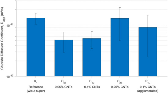 The apparent chloride diffusion coefficients (Dapp) for specimens R1, C05, C10, C25, and P10 (all cured for 28 days prior to testing for a total of 9 months) are presented in Figure 11. A comparison of the results reveals that the addition of well-dispersed CNTs up to a dosage of 0.1 wt.% reduced the apparent chloride diffusion coefficient of the cementitious nanocomposite by as much as 63% compared with the reference mix R1, and the poorly dispersed CNT mix, P10, also showed a 34% reduction in the mean diffusion coefficient, but also significantly more sample variability.