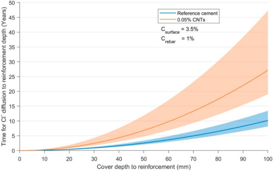 Steady-state chloride diffusion tests demonstrated that the chloride diffusion coefficient was reduced by up to 63% with the addition of superplasticiser-dispersed CNTs at a dosage of 0.05–0.1 wt.%, increasing service life by as much as 2.7 times. 0.25 wt.% CNTs did not provide an enhanced resistance to chloride diffusion compared to the reference cement paste, R1, implying an optimum CNT dosage for enhanced chloride diffusion resistance of 0.05–0.1 wt.%.