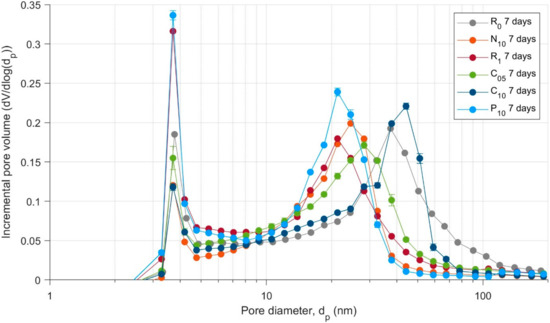 Incremental pore size distributions between pore diameters of 2.5–200 nm for specimens aged 7 days are presented in Figure 13, consisting of a peak at 20–30 nm, corresponding to the main volume of medium capillary porosity within the material, and a sharp peak at 3.8 nm diameter, associated with the nitrogen-accessible gel capillary porosity of the low-density C-S-H hydration product [44,52].