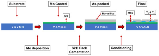 Two different sets of substrate materials were chosen and prepared for coating, pure vanadium and a V-9Si-5B alloy. In general, the pack cementation process involved a two-step procedure: (1) Depositing a Mo layer on the outer surface of the pure vanadium and V-Si-B substrate and (2) a co-deposition of Si and B via a powder pack treatment. The details on coating the two V and V-Si-B substrate materials will be given in the following section.