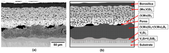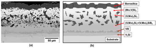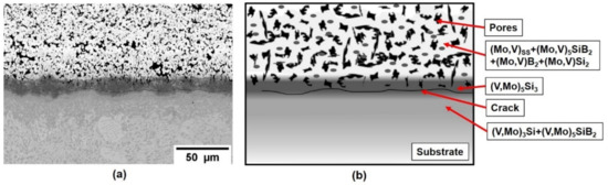 Based upon this initial success on pure vanadium, a V-Si-B three-phase VSS + V3Si + V5SiB2 alloy, V-9Si-5B, was treated in the next step. The initial as-packed state of the coating is shown in Figure 4, showing the successful implementation of Si and B into the Mo spray coat and the formation of Mo-based silicides and borides. The pores are likely a result of incomplete sintering of the Mo spray coating and/or volume changes during the phase conversation upon conditioning. Between substrate and the silicide- and boride-phases a (V, Mo)5Si3 and cracks have formed. The crack formation is likely related to the mismatch in the coefficient of expansion between the c axis of (V, Mo)5Si3 which is above 10 × 10−6 K−1 [26] compared to the adjacent phases. However, the crack does not propagate into the substrate or cause coating delamination.