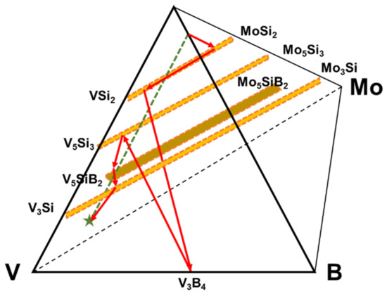 The diffusion pathway associated with the phase evolution is plotted in the V-Si-B-Mo quaternary diagram that is shown by involving only the relevant phases in Figure 3.