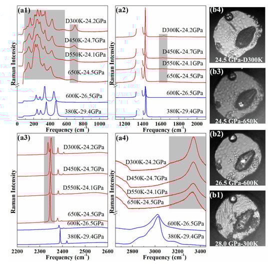 Upon heating the sample initally at 30 GPa at 300 K, the pressure slowly reduced to 26.5 GPa at 600 K. At 600 K–26.5 GPa, the Raman spectrum of the AA + N exhibits no significant change from the one at 380 K–29.4 GPa, apart from the expected P-T induced peak shifts and slight peak broadening, as can be seen from Figure 1. When the temperature was raised to 650 K, the Raman spectrum of the sample suddenly changed, especially in the frequency ranges colored in gray in Figure 1a. The sample light absorption also increased at this temperature [see the photographs in Figure 1b]. After holding for 10 min., some Raman peaks disappeared or weakened. After half an hour, the Raman spectrum of the sample no longer varied; it also qualitatively stayed the same when the sample was cooled down to room temperature at the same pressure.