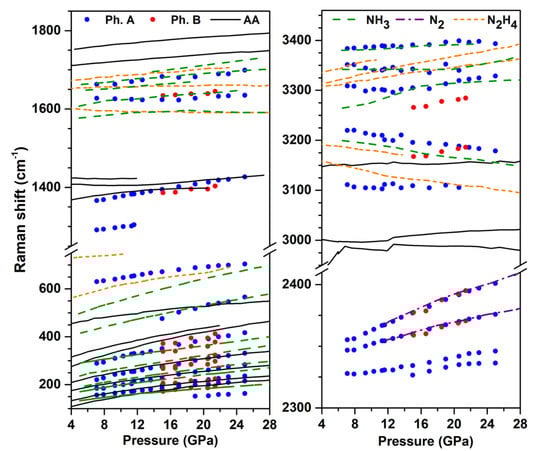 Figure 2 shows the evolution of the Raman mode frequencies with pressure at 300 K, and compares them to those of the pure AA [14], N [32], NH [33,34] and hydrazine (NH) [35] solids obtained from literature. We recall that NH (and possibly heavier, unidentified azanes) and NH (below 10 GPa on decompression) were identified as reaction products of N + H mixtures at high pressure [3,6,8,9], which justifies the present comparison. The higher frequency modes correspond to N-H stretching, and the deconvolution of the observed band reveals at least five peaks in the 3100–3400 cm range. It can be seen that four of these N-H peaks nearly coincide with those of the pure ammonia solid reported in Refs. [33,34]; the small frequecy differences are likely due to the different sample temperature, which was 50 K in Ref. [34]. There is also a good match between the observed modes in the 1620–1700 cm region with the reported torsion modes of NH, and the same is true for the lattice mode around 500 cm at 20 GPa, which corresponds to the Ae mode of NH [34]. The frequency region below 400 cm in phase A is composed of many peaks and is more difficult to analyze in details. These observations strongly suggest that ammonia is one of the reaction products and separated in solid form from the other products. The disappearance of the N-H stretch and bending modes of NH also show that these ions disappeared and probably converted to NH.