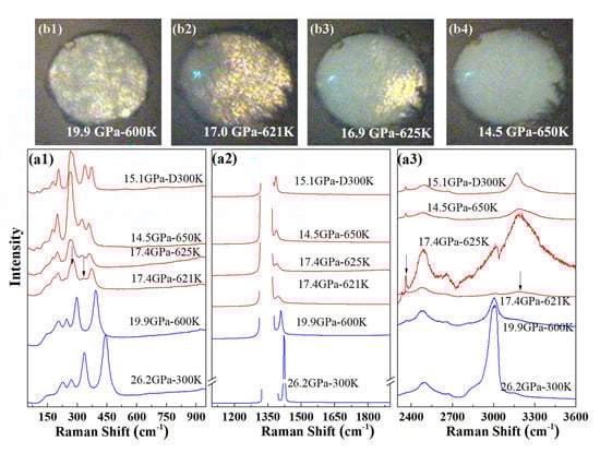 At P∼15 GPa, the Raman spectrum was collected at 100 K steps and showed no phase transition to 600 K (see Figure S3 of the SI). At 700 K, nitrogen became liquid and the AA sample decomposed quickly and dissolved into liquid nitrogen. Only the Raman band of the N molecule stretching could be clearly observed at this temperature. Upon cooling back to 300 K, N-H stretch modes in the range 3150–3450 cm were also detected at several positions, which are compatible with the Raman spectrum of ammonia (see Figure S4 of SI). The reasons why NH was not detected at high temperature likely comes from its dilution in the N liquid, the small AA sample volume, which was loaded as compared to that of N and weaker Raman intensity at high T. At 13 GPa–300 K, N and NH were solid and phase separated (hence, the inhomogeneous aspect of the sample shown in panel (a4) of Figure S3), and a stronger Raman signal from the NH solid was recorded in sample regions, where NH crystallized. Although not tested, we consider it unlikely that H was formed in the decomposition of AA, since (1) none were formed at higher pressures (see below) and (2) NH is more stable than N + H at this pressure [4,30,31]. Thus, we conclude that AA is not stable and decompose into N and NH in the presence of liquid N at 15 GPa. For this reason, we took care not to cross the N melting line in the two subsequent heating runs at 20 GPa and 30 GPa. The heating rate was in these cases 50 K/step. Since the experimental results for these two pressures are identical (see Figures S5–S7 of the SI), we only report below the results obtained on heating at 30 GPa.
